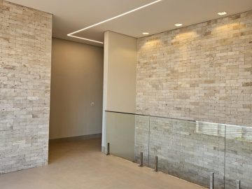 Detalhes : Pedra natural travertino nacional anticato tipo bricks e ripado de madeira na garagem