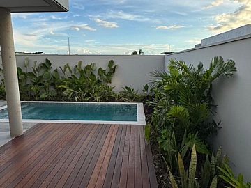 Piscina revestida com pastilha Atlas, deck de madeira e trocador de calor