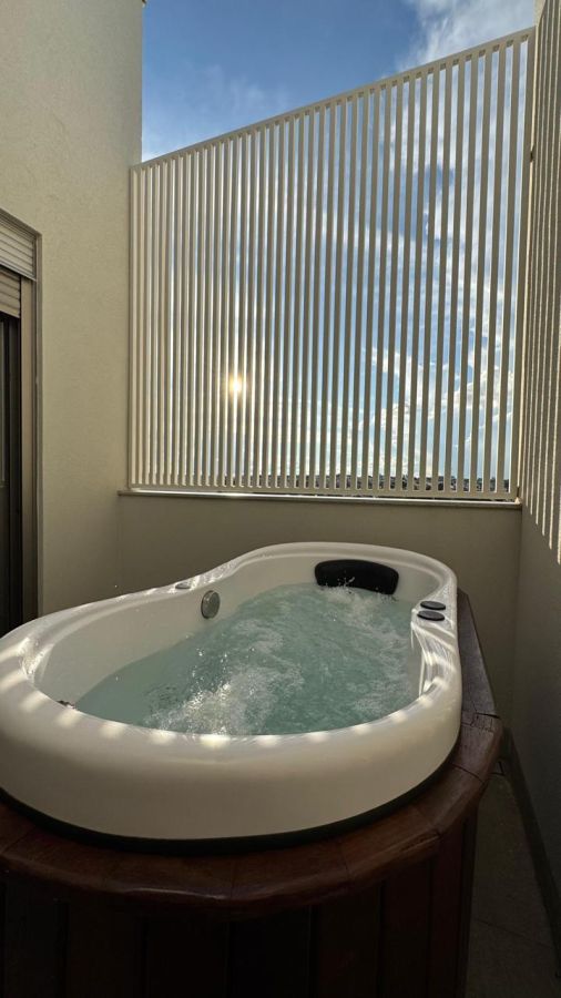 3 suítes no pavimento superior, todas com sacada, sendo que a suíte master, com mais de 42m², conta com um terraço exclusivo com ofurô. As outras duas suítes contam com banheiro com zenital de blindex com abertura e fechamento automático nos boxes.