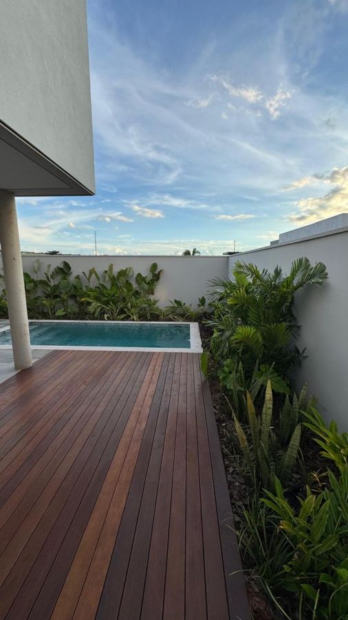 Piscina revestida com pastilha Atlas, deck de madeira e trocador de calor
