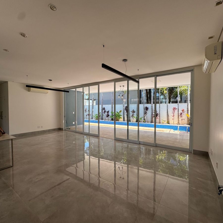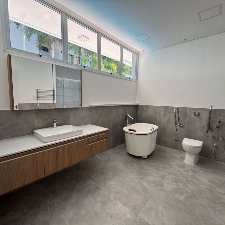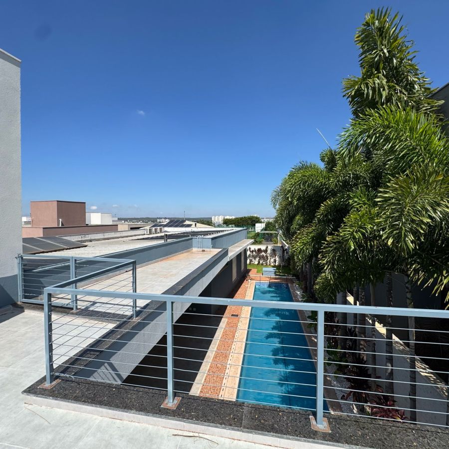 No exterior, um escritório com vista para a piscina amplia as possibilidades de uso dos espaços podendo ser mais 1 quarto, ou academia, brinquedoteca, dentre outras. A piscina aquecida, com raia de 15 metros, é perfeita para a prática de natação. A irrigação automatizada garante a manutenção impecável do paisagismo, proporcionando um ambiente harmonioso, enquanto a garagem fechada não só proporciona segurança, mas também acesso direto à residência e à área da piscina. A garagem conta ainda com uma ampla despensa e uma estação elevatória que conecta a um sótão e a uma varanda, oferecendo vistas privilegiadas tanto da área interna quanto do exterior.