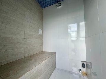 Terraço externo com Spa para 4 pessoas (14 jatos, cromoterapia, ozonioterapia e aquecimento), Sauna a vapor e Ducha aquecida