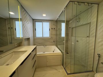 5 suítes, incluindo Suíte Master com TV Samsung embutida no armário, closet amplo e banheiro com banheira Jacuzzi dupla, cromoterapia e acabamentos Kohler