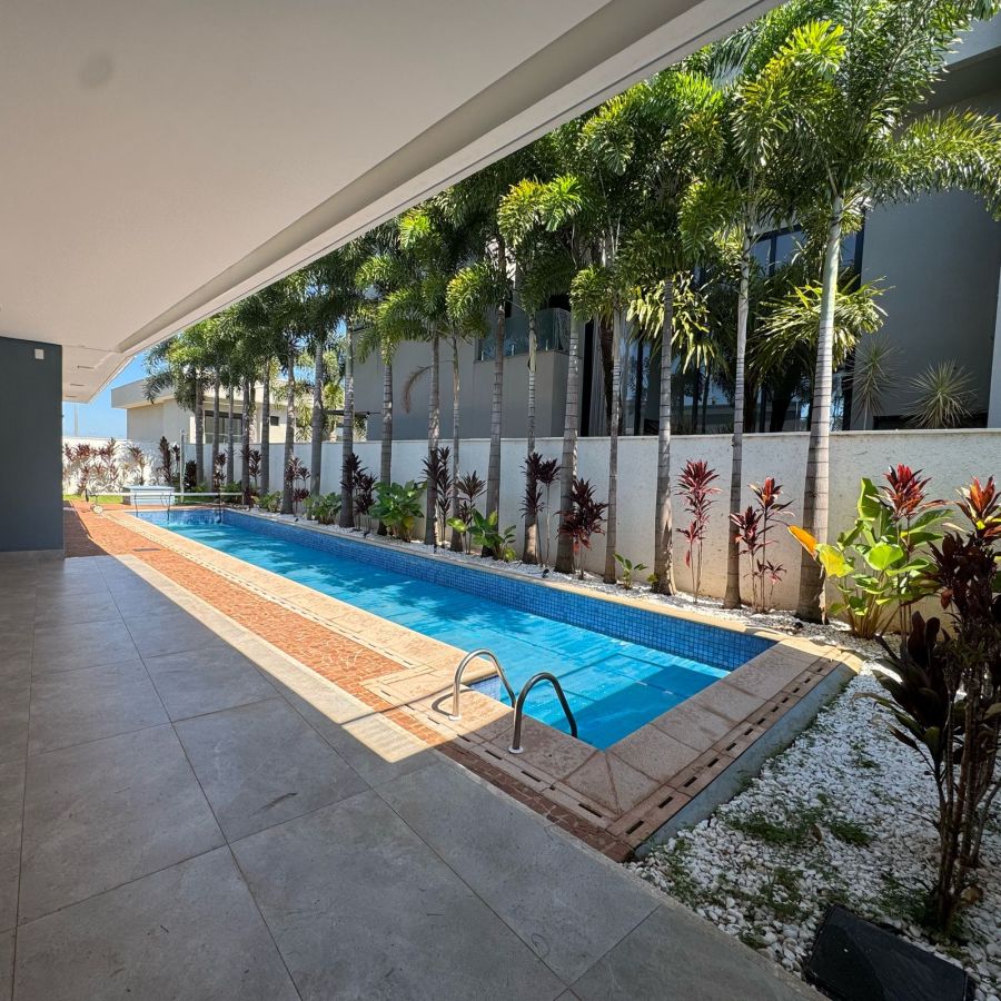 No exterior, um escritório com vista para a piscina amplia as possibilidades de uso dos espaços podendo ser mais 1 quarto, ou academia, brinquedoteca, dentre outras. A piscina aquecida, com raia de 15 metros, é perfeita para a prática de natação. A irrigação automatizada garante a manutenção impecável do paisagismo, proporcionando um ambiente harmonioso, enquanto a garagem fechada não só proporciona segurança, mas também acesso direto à residência e à área da piscina. A garagem conta ainda com uma ampla despensa e uma estação elevatória que conecta a um sótão e a uma varanda, oferecendo vistas privilegiadas tanto da área interna quanto do exterior.